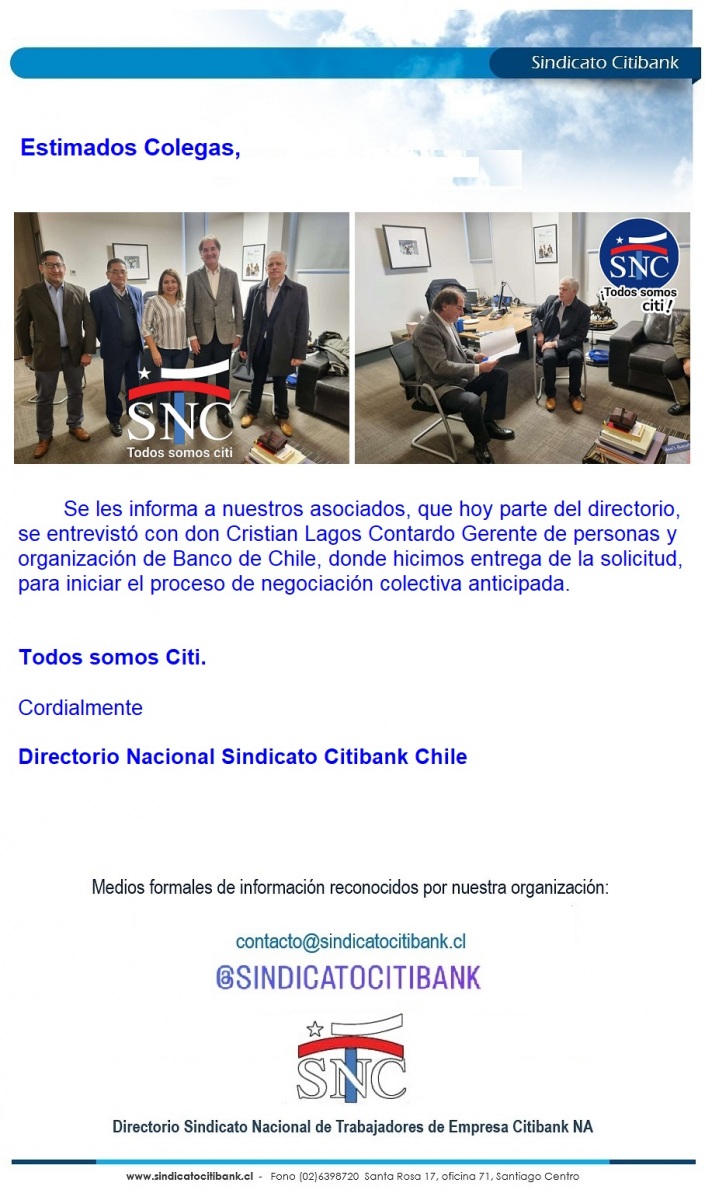 Se les informa a nuestros asociados, que hoy parte del directorio, se entrevistó con don Cristian Lagos Contardo Gerente de personas y organización de Banco de Chile, donde hicimos entrega de la solicitud, para iniciar el proceso de negociación colectiva anticipada.