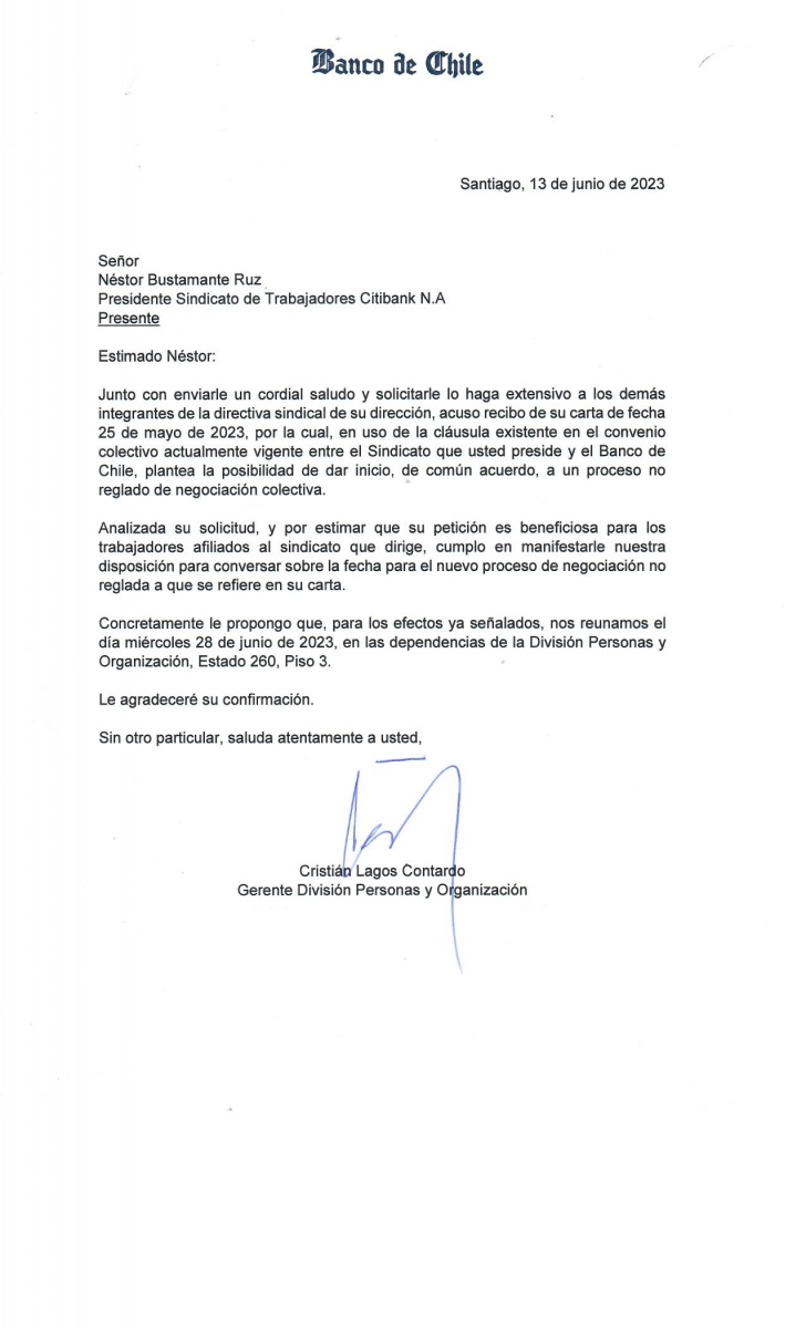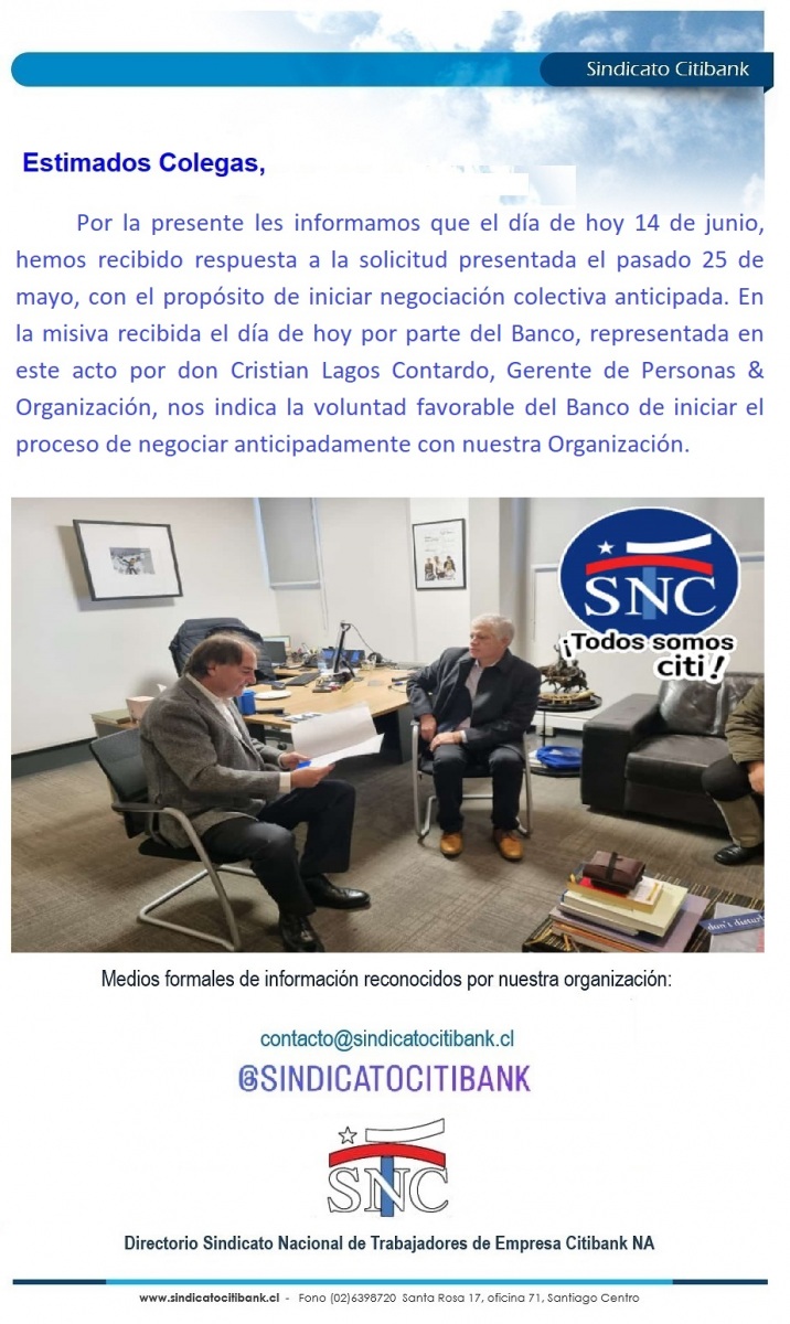 Por la presente les informamos que el día de hoy 14 de junio, hemos recibido respuesta a la solicitud presentada el pasado 25 de mayo, con el propósito de iniciar negociación colectiva anticipada. En la misiva recibida el día de hoy por parte del Banco, representada en este acto por don Cristian Lagos Contardo, Gerente de Personas & Organización, nos indica la voluntad favorable del Banco de iniciar el proceso de negociar anticipadamente con nuestra Organización.